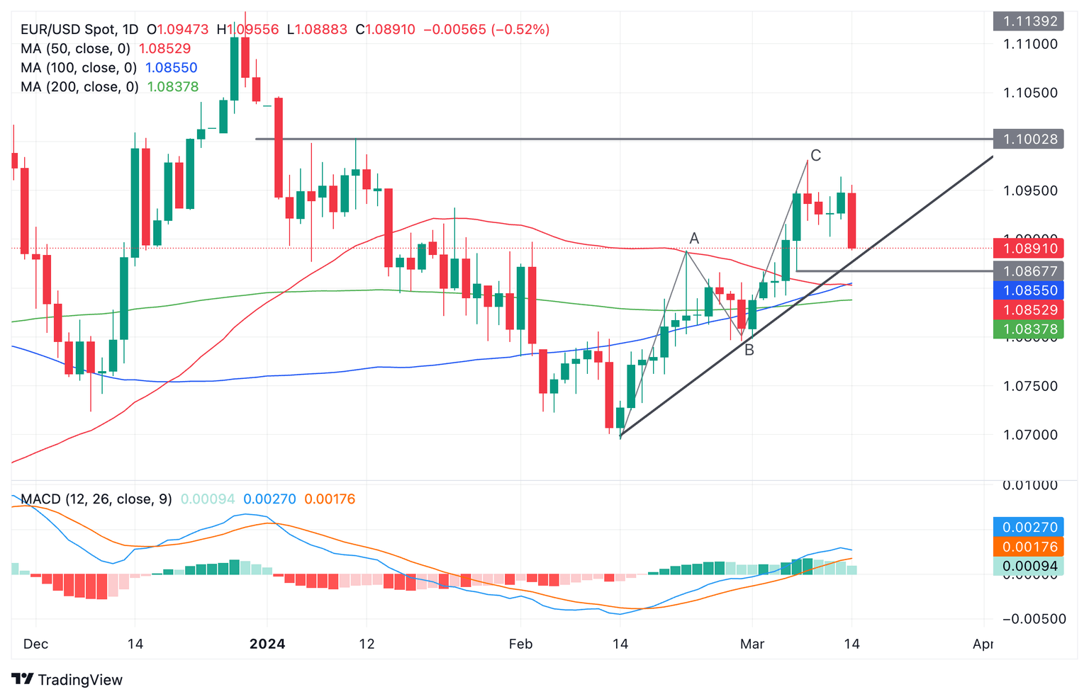 EUR/USD is correcting steeply on Thursday, continuing the the pullback from the 1.0981 March 8 high.