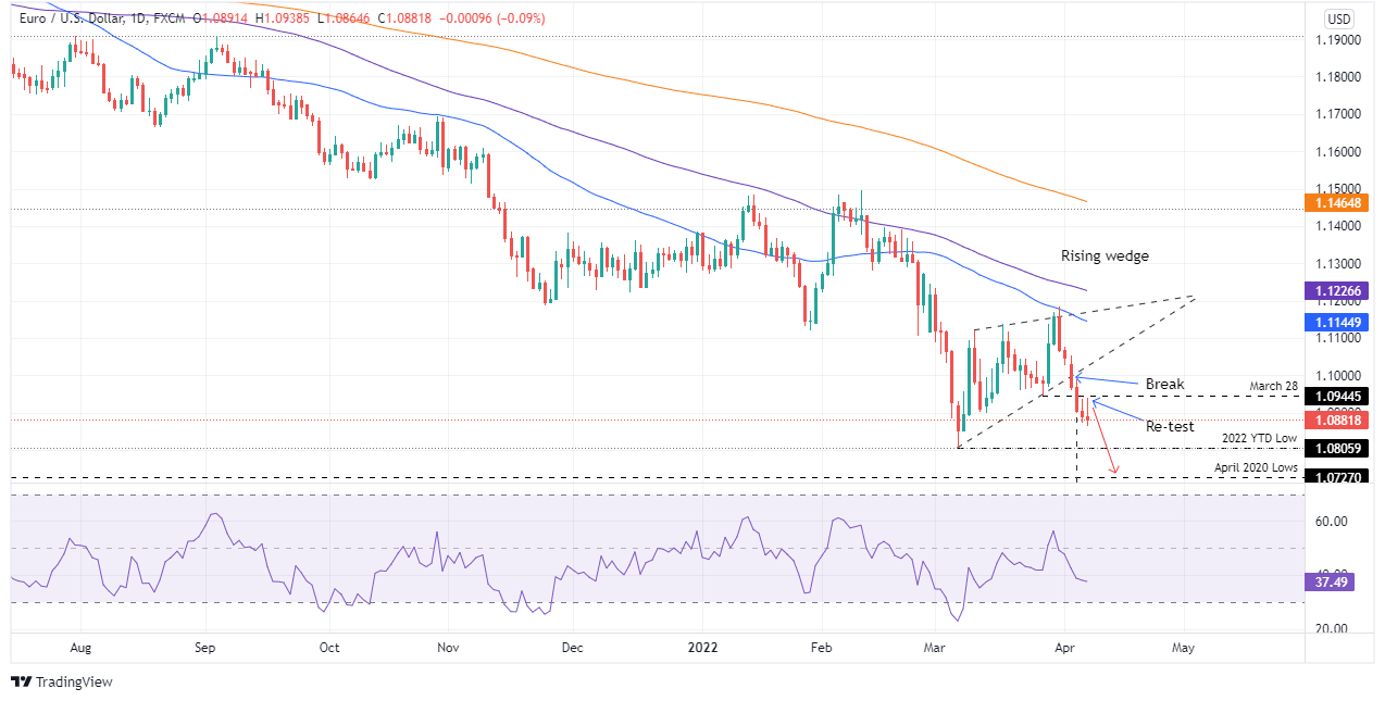 EUR/USD back below 1.0900 as a rising wedge targets 1.0700 despite hawkish ECB minutes