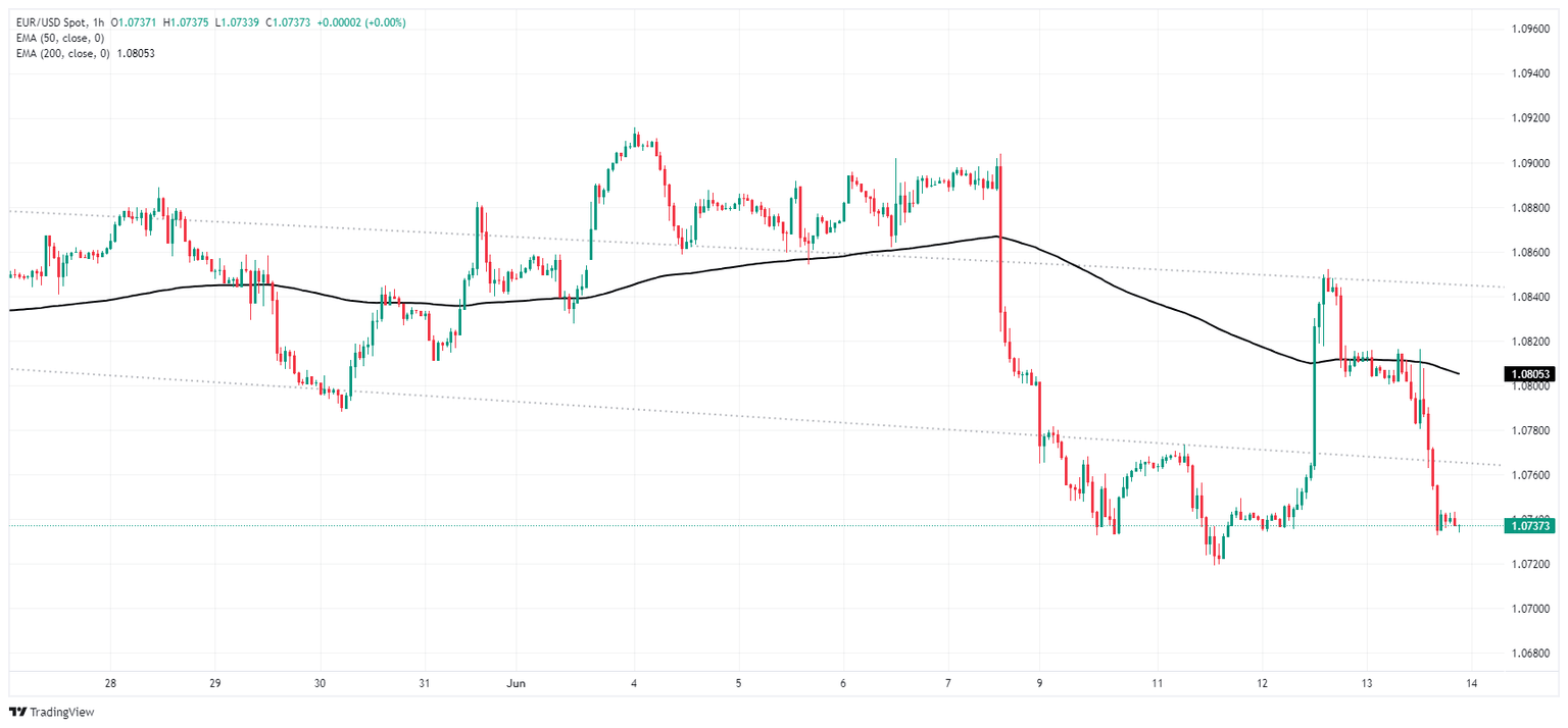 Thursday’s decline has sent EUR/USD back into recent lows as the pair struggles to hold onto chart territory north of 1.0750. Fiber bids were unable to dig in a foothold above the 200-hour Exponential Moving Average (EMA) at 1.0804 this week, and the pair heads into Friday’s trading sessions on the back foot.