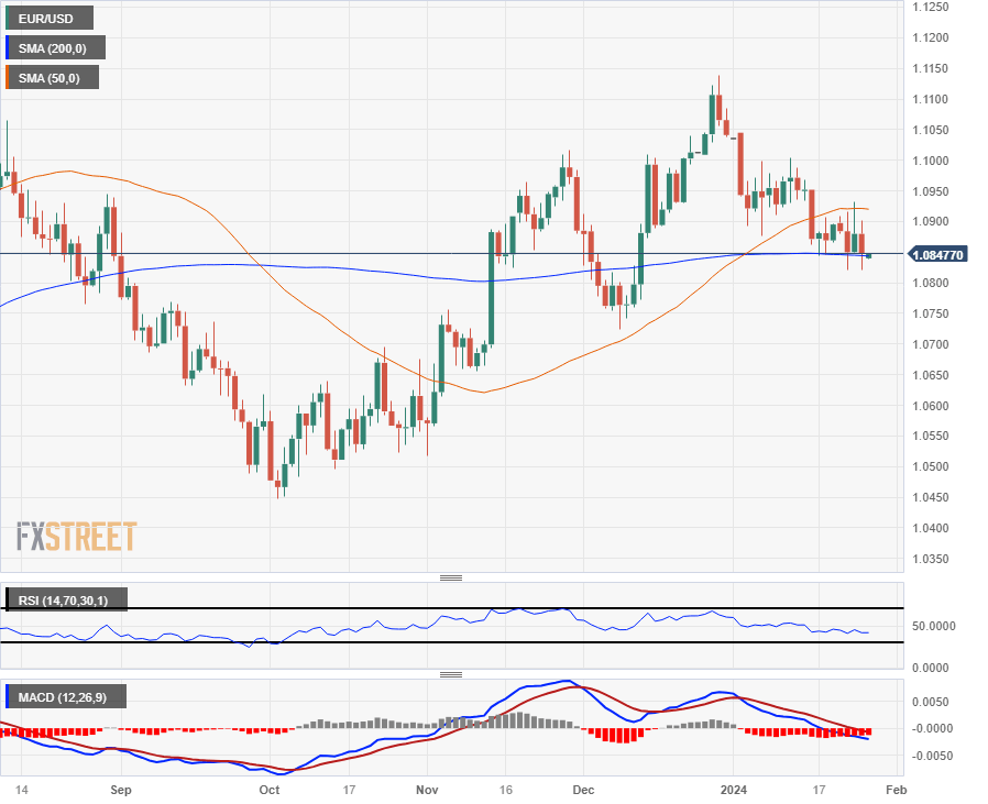 EUR/USD tumbled back into the low side of 1.0850 as the pair resumes cycling within familiar levels on the week, with bearish flows forcing the Euro (EUR) further down against the US Dollar (USD) after the European Central Bank (ECB) held rates steady and US Gross Domestic Product (GDP) figures grew faster than expected in the fourth quarter.