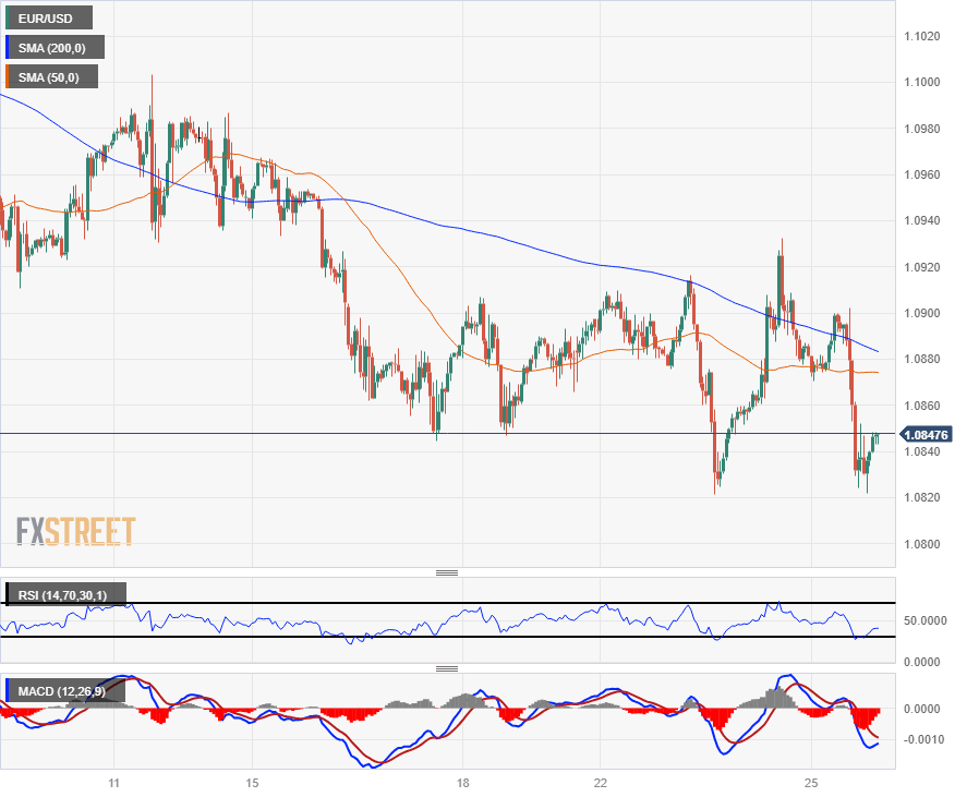 EUR/USD saw another rejection from the 200-hour Simple Moving Average (SMA) dropping into 1.0880, and intraday price action found a near-term bottom just above 1.0820 before settling Thursday close to the 1.0850 level.