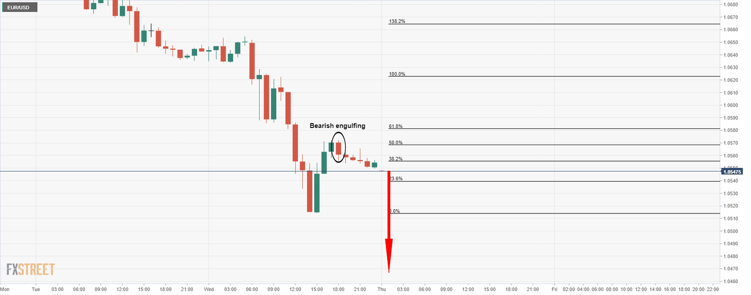 From an hourly perspective, there is the potential for a downward continuation as per the correction meeting the 50% mean reversion mark, a bearish engulfing and drift to the downside again: