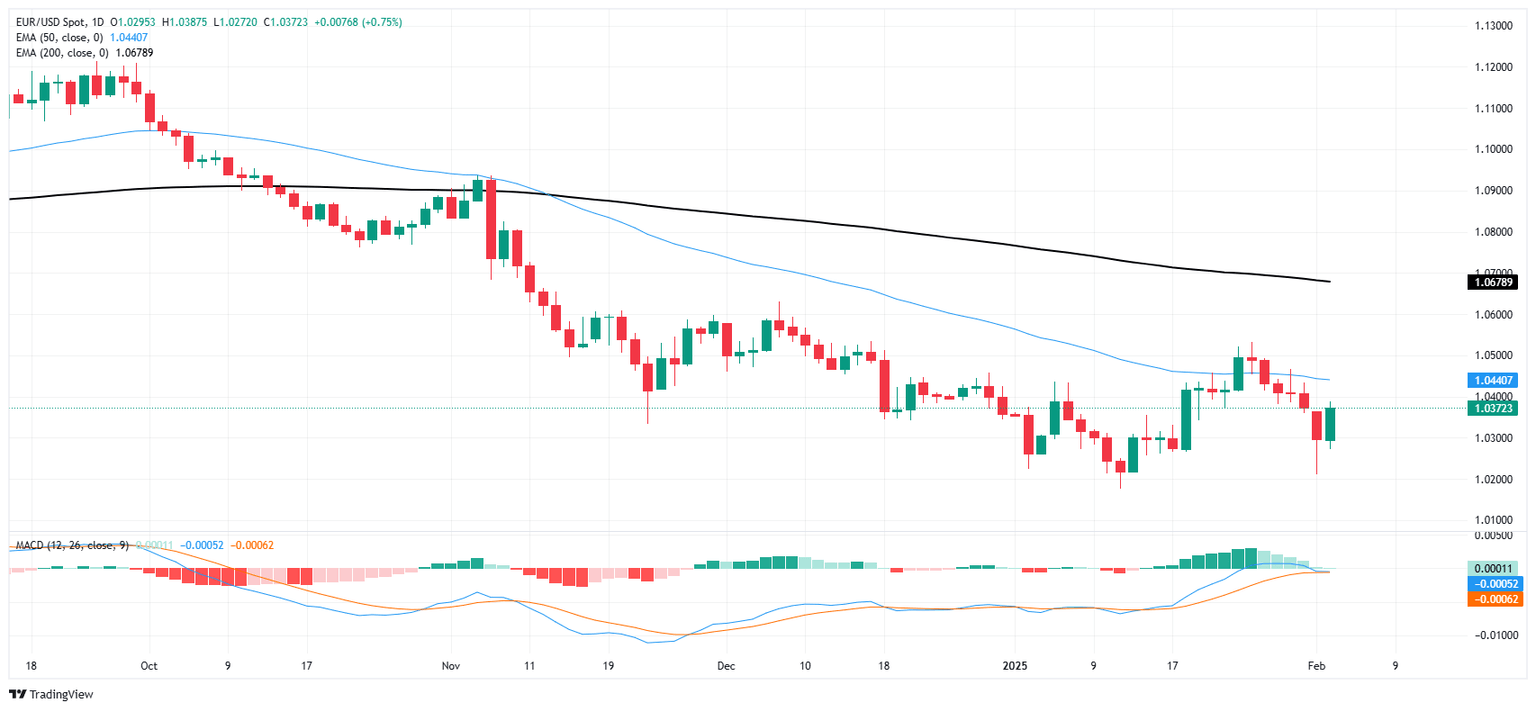 EUR/USD’s early-week plunge toward 1.0200 sparked by impending tariffs from US President Donald Trump has firmly recovered ground after the Trump administration took any excuse it could find to avert its self-imposed threats to tax its own citizens for importing goods from other countries. Threats of a flat 10% import tax on European-produced goods are still on the cards, but last-minute pivots into concessions on nearly all of President Trump’s targeted countries, except for China, has left investors confident that the posturing is simply that and nothing more. 10% import fees on goods from China are still on the table, but President Trump also failed to follow through on his threat to arbitrarily double tariffs on any countries that retaliate.