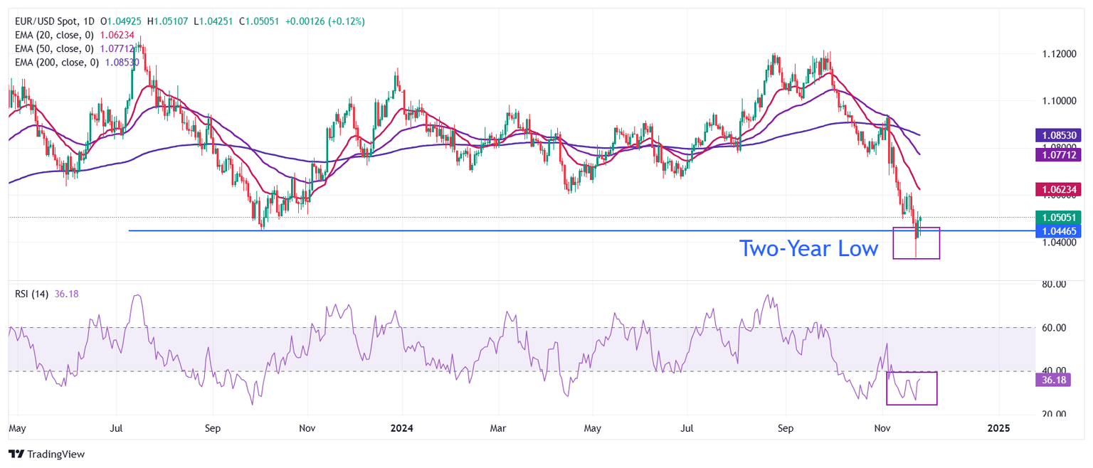 - EUR/USD rebounds and returns around 1.0500 as the US Dollar resumes its corrective trend triggered after Trump nominated Bessent for US Treasury Secretary.