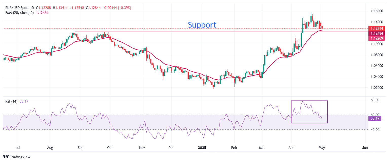 EUR/USD slips below the key level of 1.1300 in Thursday’s North American session. The pair slides to near the 20-day Exponential Moving Average (EMA), which trades around 1.1250.