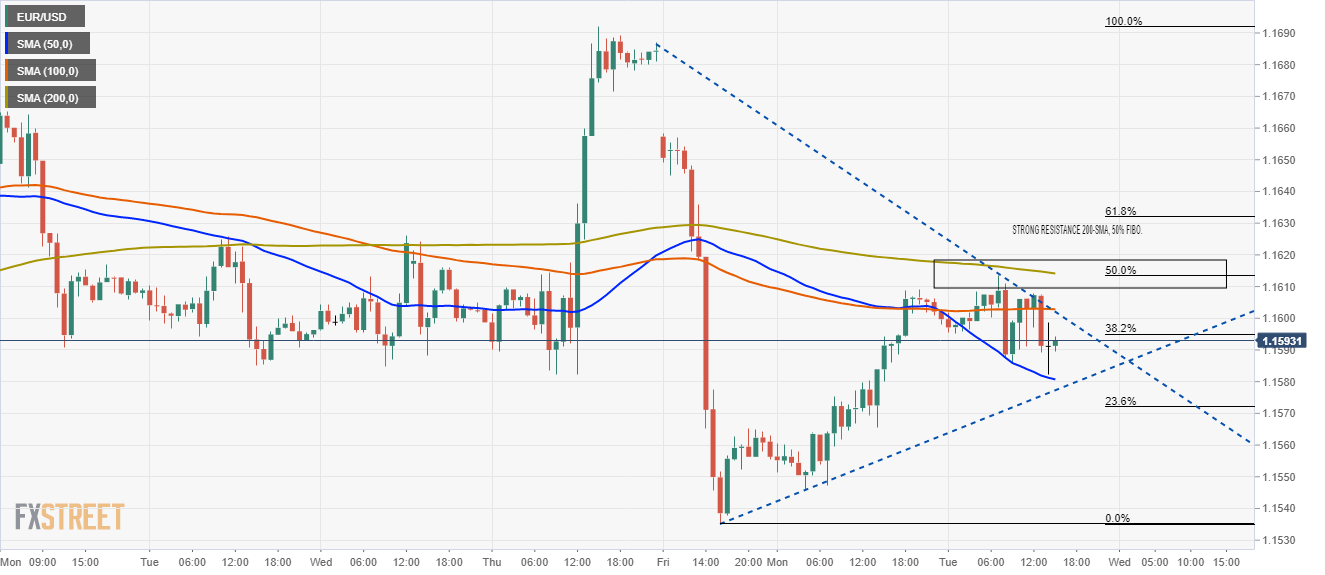 The EUR/USD chart shows the pair bounced off 1.1534, towards the 50% Fibonacci retracement at 1.1611, which confluences with Monday’s high and the 100-simple moving average. That area would oppose strong resistance to the pair, and if EUR bulls would like to regain near-term control, they will need to reclaim the 200-SMA at 1.1614.