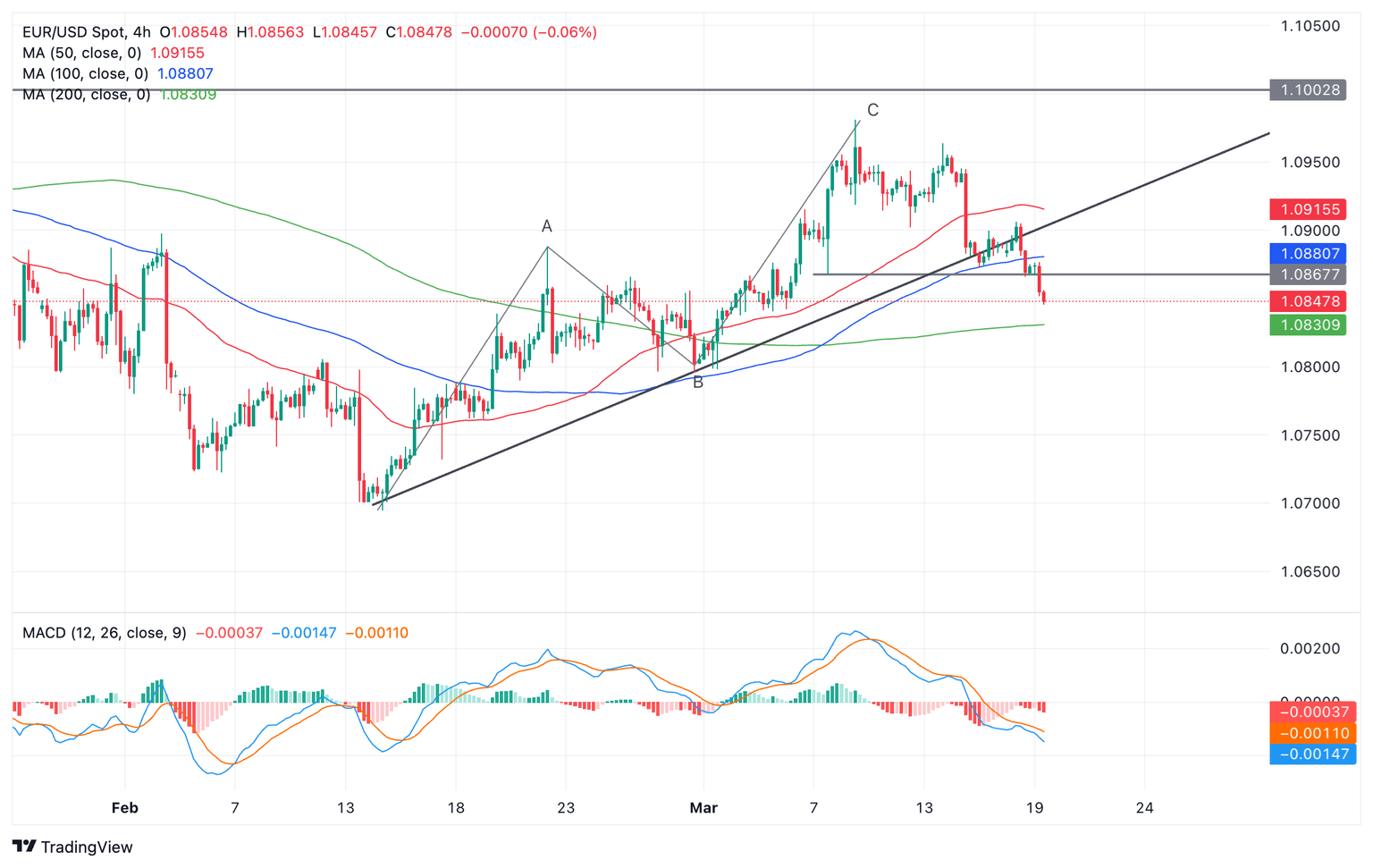 EUR/USD declines by five hundredths of a percent into the mid 1.0800s on Tuesday, before the big event of the week in Forex, the Federal Reserve’s (Fed) March meeting policy announcement.