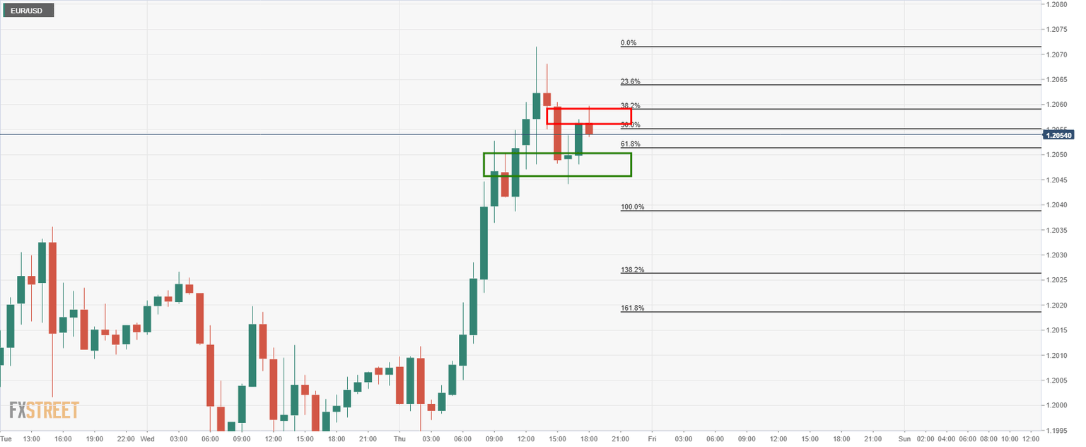 EUR/USD is currently trading at 1.2057 and higher by some 0.45% on the day travelling between a low of 1.1993 and a high of 1.2071.