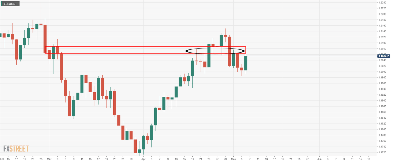As can be seen, the bulls have come back for more on the hourly chart, but are facing a wall of daily resistance that may prevent an extension head of the Non-Farm Payrolls event: