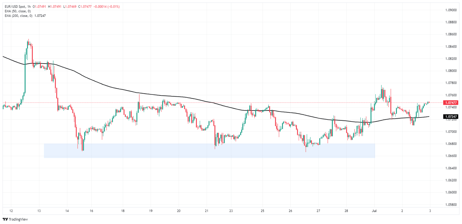 EUR/USD is extending a near-term consolidation pattern, drifting into the midrange as intraday price continues to get buoyed by a supply zone priced in below 1.0680. The Fiber is cycling median bids near the 200-hour Exponential Moving Average (EMA) near 1.0725.