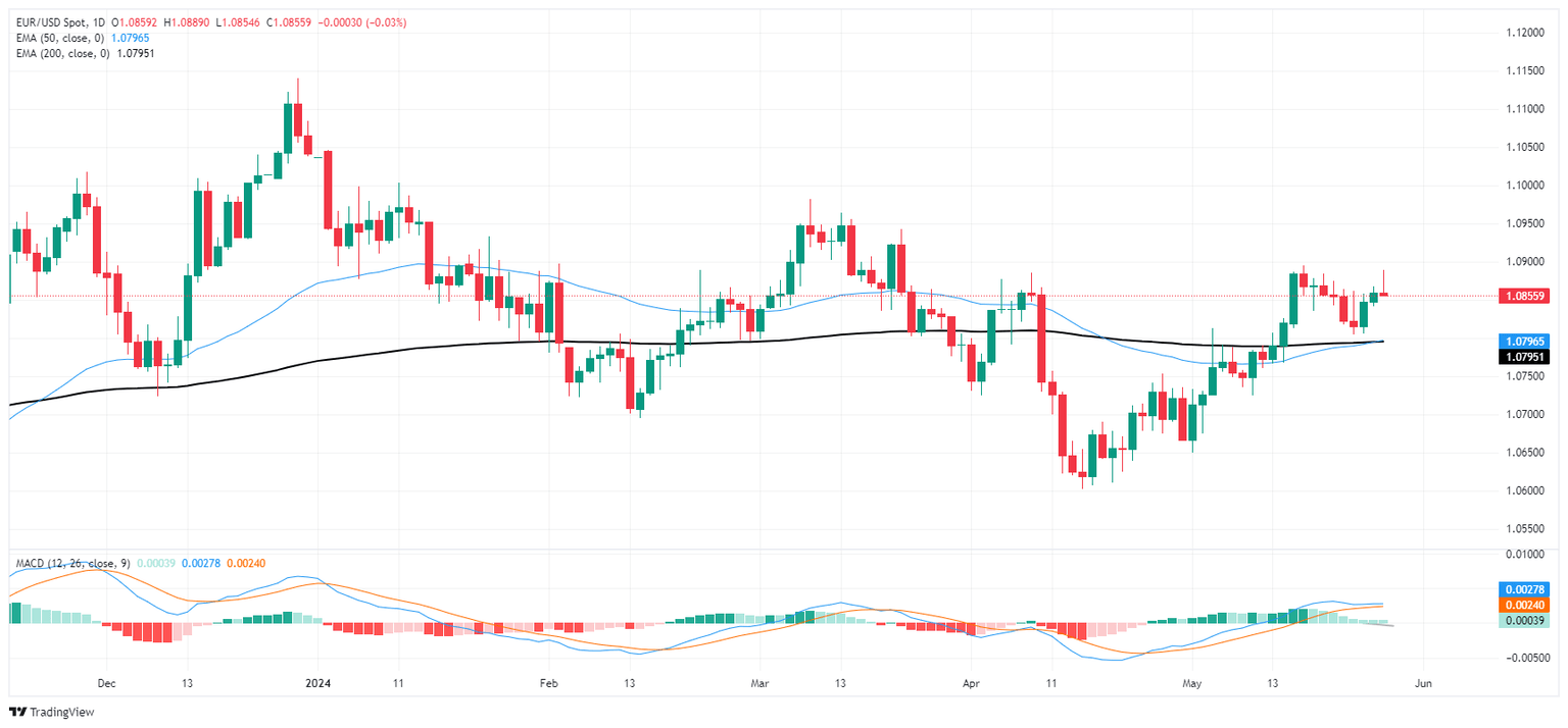 EUR/USD rose to an intraday high near 1.0890 on Tuesday before market flows dragged the pair back down to familiar levels near 1.0860, and the pair is holding on-balance as Euro traders head into a fresh print of German Consumer Price Index (CPI) inflation. Key US data hides just around the corner with Gross Domestic Product (GDP) and Personal Consumption Expenditure (PCE) Price Index inflation due on Thursday and Friday, respectively.