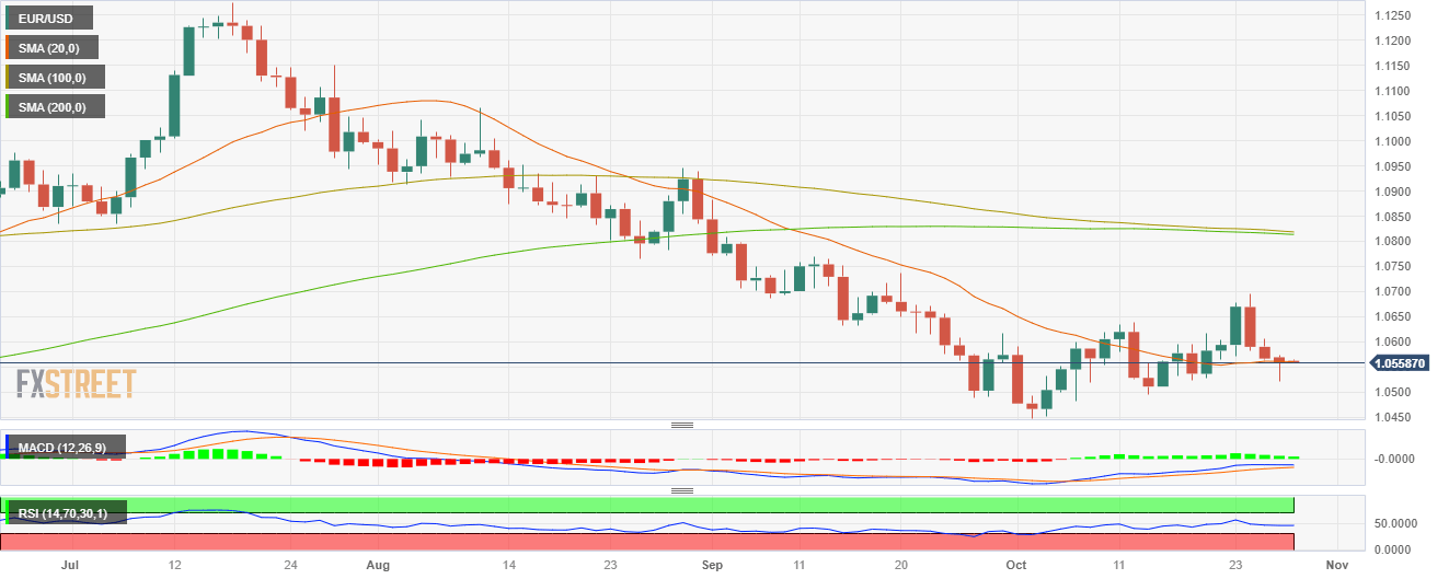 - EUR/USD bottomed at a daily low of 1.0521 and recovered towards the 20-day SMA, around 1.0560.
