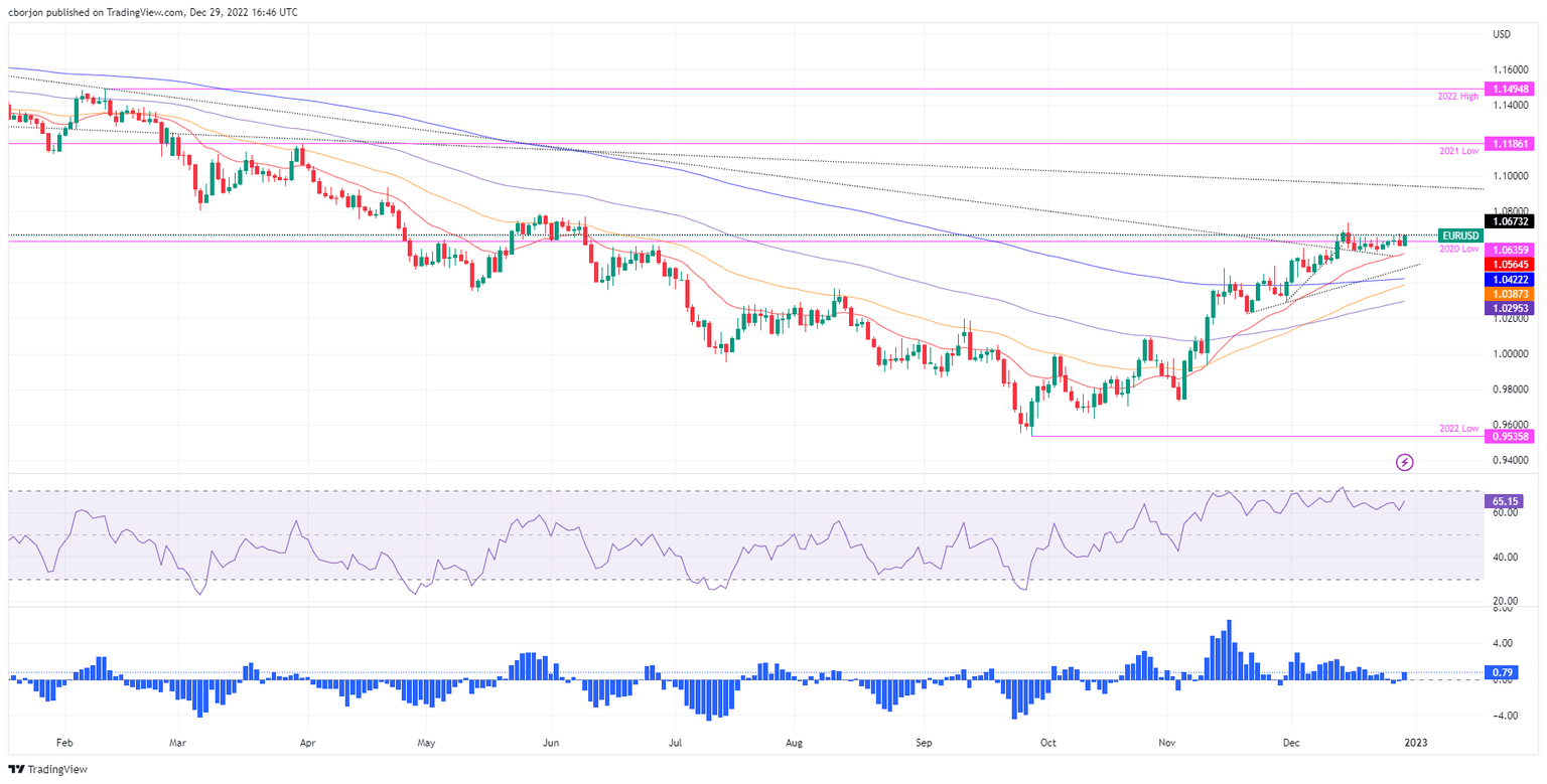 The Euro (EUR) held to its gains vs. the American Dollar (USD) as sentiment improved ahead of the last trading day of 2022. Data from the United States (US) showed a slight jump in unemployment claims, boosting the EUR/USD, while China’s Covid-19 relaxing restrictions keep investors nervous. At the time of writing, the EUR/USD is trading at 1.0660.
