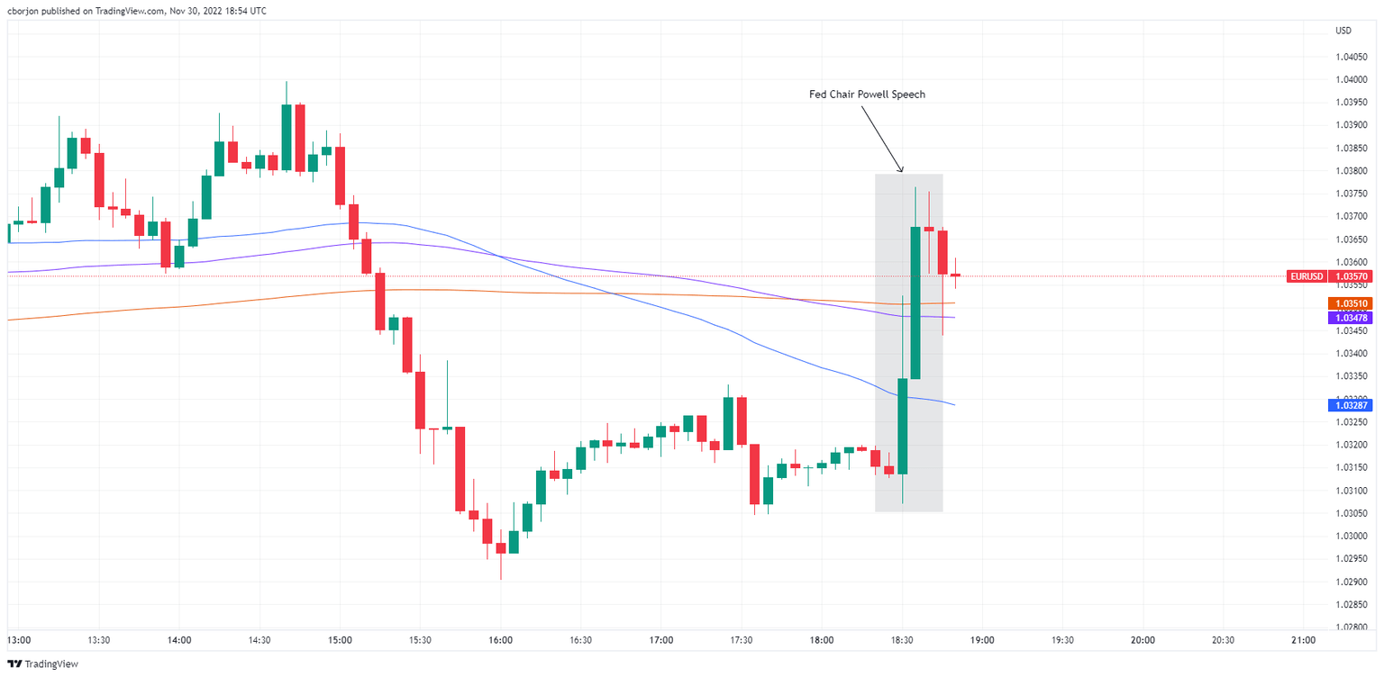 The EUR/USD jumped from weekly lows of 1.0290 as the Federal Reserve (Fed) Chair Jerome Powell acknowledged that moderation in the speed of interest rate increases might come as soon as the next meeting. That said, the Euro (EUR) is climbing, while the US Dollar Index (DXY) turned negative, dropping 0.42%. At the time of writing, the EUR/USD remains volatile, trading within 1.0300/1.0380, as Powell continues.