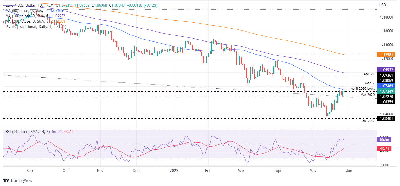 The EUR/USD advanced in the day and pierced the 50-day moving average (DMA) at 1.0746, pushing towards 1.0765 (new weekly highs). However, EUR/USD bulls’ failure to sustain the rally dragged spot prices below the abovementioned. However, they could remain hopeful as the Relative Strength Index (RSI) at 56 persists in bullish territory, aiming higher.