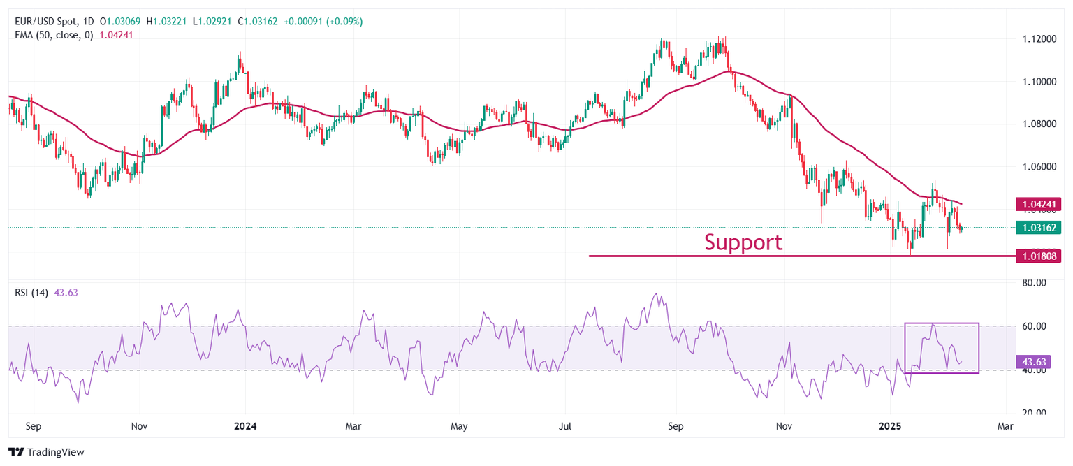 EUR/USD trades inside Monday’s trading range around 1.0300 in Tuesday’s North American session. The outlook of the major currency pair remains bearish as the 50-day Exponential Moving Average (EMA) around 1.0430 continues to be a major barricade for the Euro bulls.