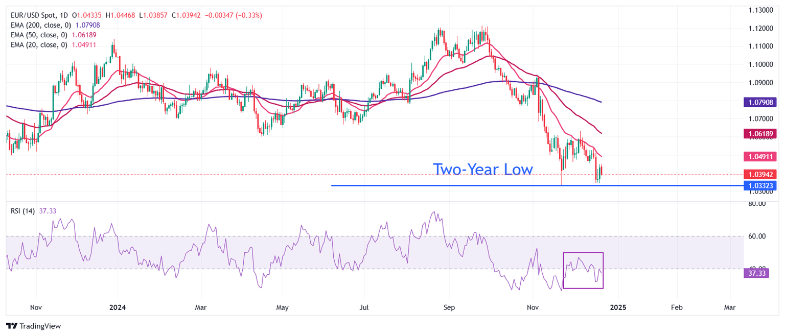 EUR/USD sustains below 1.0400 in Monday's North American session as the US Dollar (USD) bounces back on Monday after a sharp sell-off on Friday. The US Dollar Index (DXY), which tracks the Greenback’s value against six major currencies, climbs to near 108.20. The Greenback gains as Federal Reserve (Fed) policymakers see the central bank delivering fewer interest rate cuts next year amid a slowdown in the disinflation process and the uncertainty over the impact on the economy of incoming immigration, trade, and tax policies by President-elect Donald Trump.