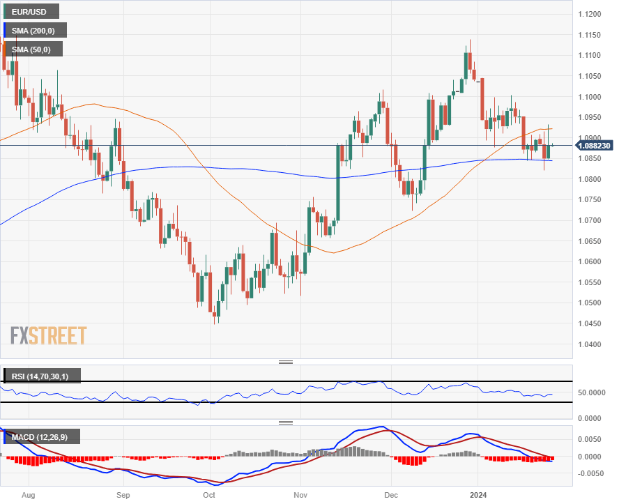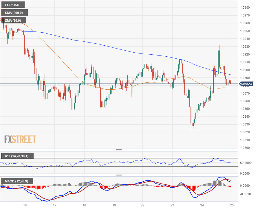 The EUR/USD saw a sharp rejection after climbing through the 200-hour Simple Moving Average (SMA) near 1.0895, peaking at a near-term intraday high above 1.0930 before getting forced back down and settling Wednesday near the familiar 1.0880 level.