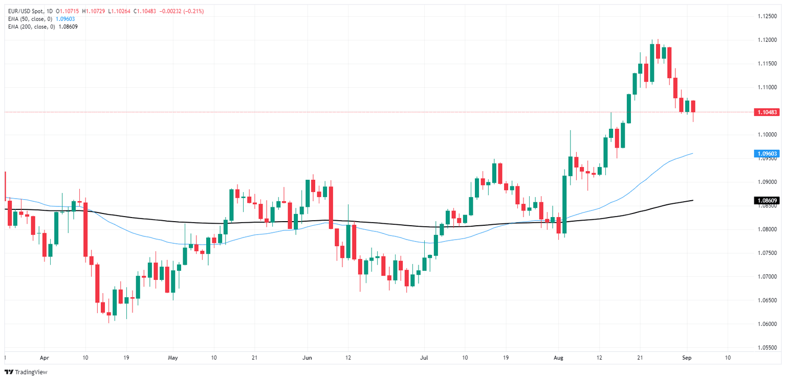 EUR/USD tilted further into the low side on Tuesday, with intraday bottom bids testing into two-week lows before settling the day near 1.1050 once again. Price action remains limited as markets gear up for one last US Nonfarm Payrolls (NFP) print this week, but a flop in US ISM Purchasing Managers Index (PMI) figures reignited fears of an impending recession.