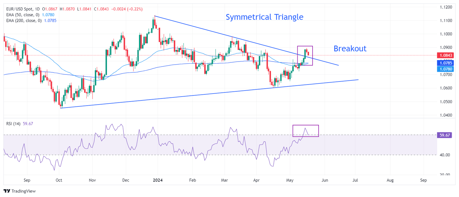 EUR/USD recovers after gradually declining towards the breakout region of the Symmetrical Triangle formation, which is around 1.0830. The near-term outlook of the major currency pair remains bullish as a breakout of a triangle formation results in heavy buying volume and wider ticks. The shared currency pair seems well-established above the 50-day and 200-day Exponential Moving Averages (EMAs), which trade around 1.0780 and 1.0788, respectively.
