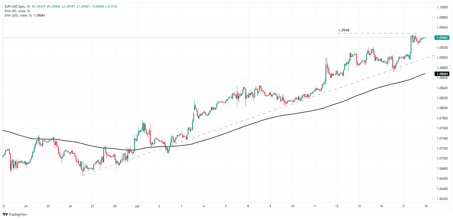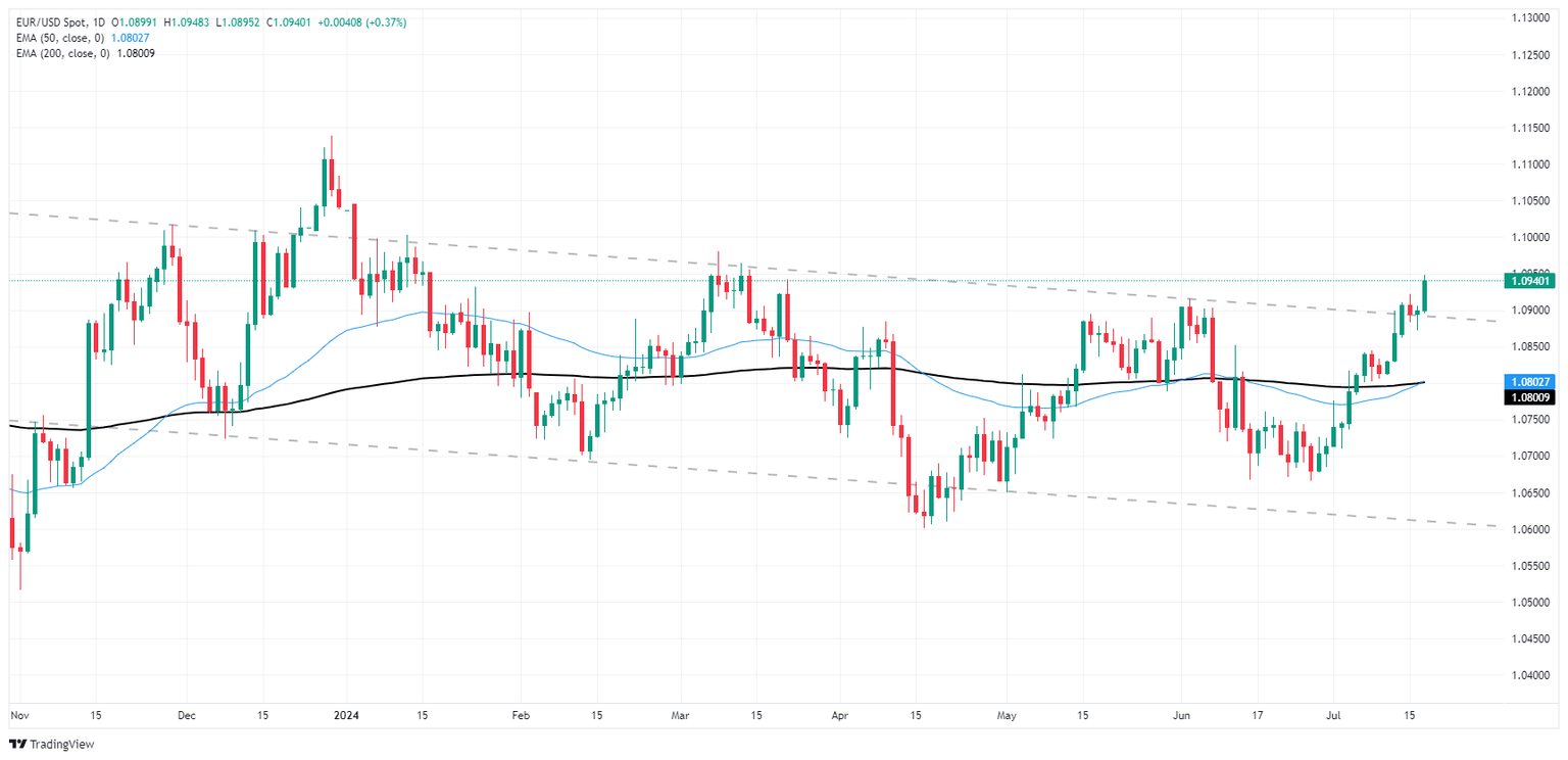 EUR/USD follows a near-term rising trendline from late June’s bottom bids near 1.0670, clipping into an 18-week peak just shy of 1.0950. An extension of the Fiber’s topside recovery has sent bids through the top end of a rough descending channel, and bidders are running out of footholds as short pressure gathers to drag the pair back down to the 200-day Exponential Moving Average (EMA) at 1.0800.