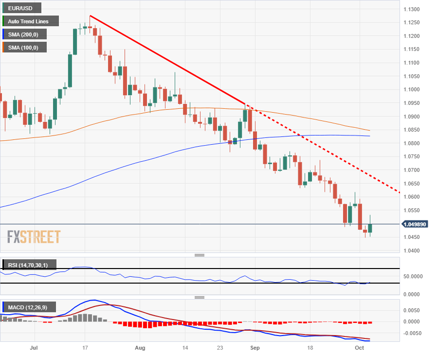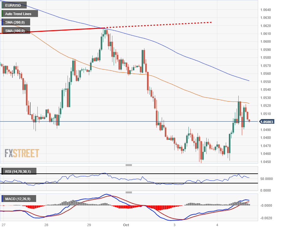 The EUR/USD is falling back to the 1.0500 major level after getting rejected from the 100-hour Simple Moving Average (SMA) near the day's peak at 1.0532. Intraday action is seeing a resistance cap from the 200-hour SMA that is dropping into 1.0550, and the day's low was marked in early just shy of 1.0450.
