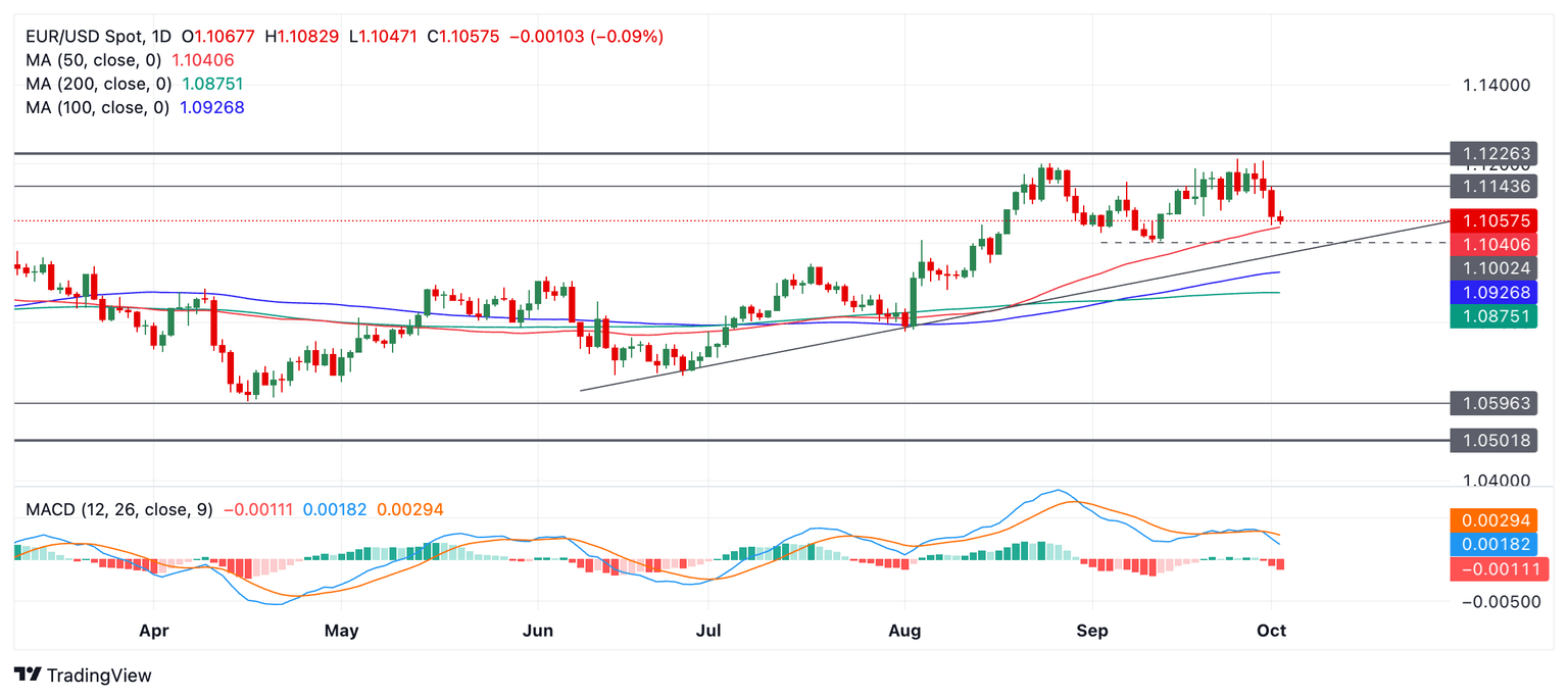 EUR/USD trades lower in the 1.1050s on Wednesday, after falling from 1.1135 on Tuesday, in a sell-off that amounted to a 0.60% one-day decline.