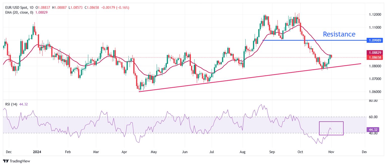 EUR/USD gives up gains after facing selling pressure near the key resistance of 1.0900 in North American trading hours on Friday. The major currency pair drops as the US Dollar (USD) bounces back strongly in the aftermath of the United States (US) Nonfarm Payrolls (NFP) data for October. Initial reaction from the US Dollar was negative, however, it rebounded strongly, with the US Dollar Index (DXY) returning back above 104.00.