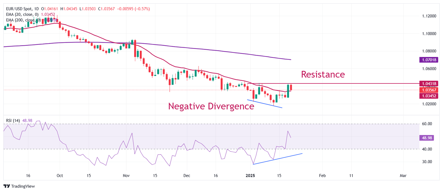 EUR/USD drops after revisiting a two-week high of 1.0430 in Tuesday’s European session. The major currency pair rebounds after a divergence in momentum and price action. The 14-day Relative Strength Index (RSI) formed a higher low, while the pair made lower lows.