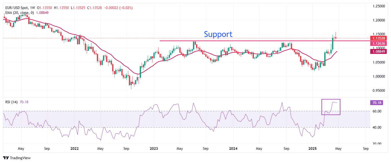 EUR/USD drops to near 1.1350 on Friday. However, the outlook of the major currency pair remains bullish as the 20-week Exponential Moving Average (EMA) is sloping higher around 1.0885.