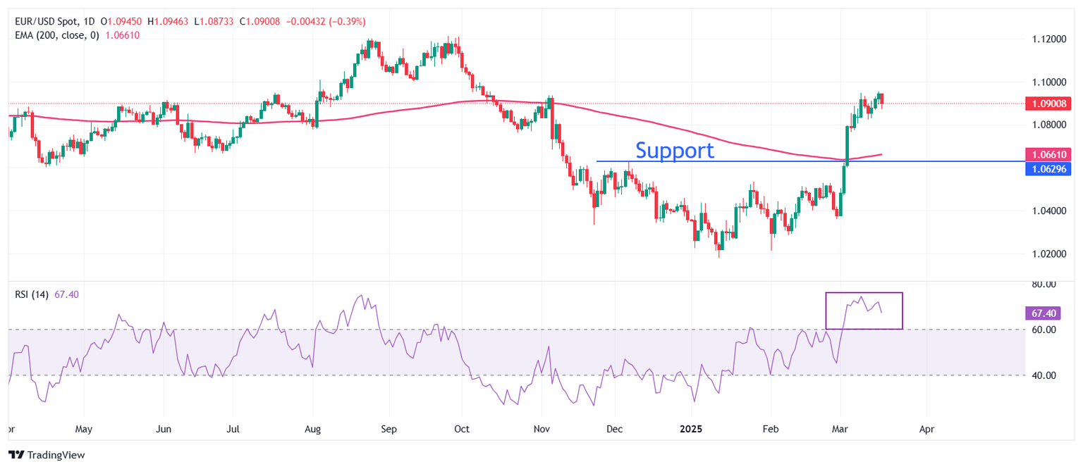 EUR/USD struggles to extend its upside above 1.0950. However, the long-term outlook of the major currency pair remains firm as it holds above the 200-day Exponential Moving Average (EMA), which trades around 1.0660.