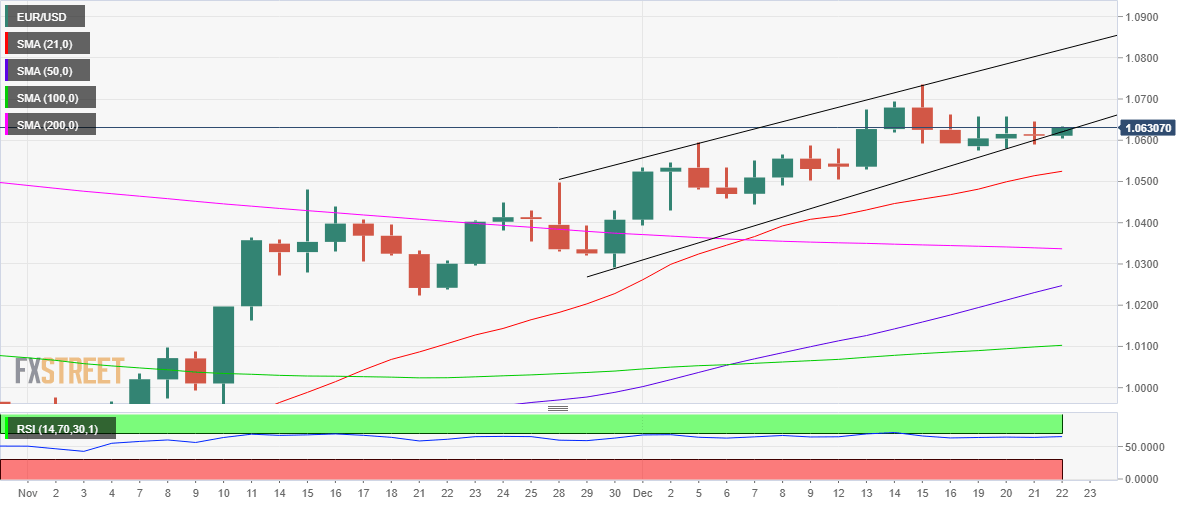 EUR/USD is attempting a rebound toward 1.0650 in Thursday’s Asian trading. The US Dollar comes under renewed selling pressure amid a risk-on market profile, as investors finally see a ‘Santa rally’ coming through. The upbeat market mood is also doing little to keep the sentiment around the US Treasury bond yields buoyed. Negative Treasury yields are also aiding the bounce in the EUR/USD pair. The benchmark 10-year US rates are down roughly 1% on the day at 3.65%, as of writing.