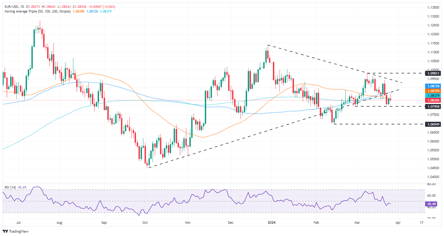 The Euro retraces against the US Dollar from weekly highs hit at 1.0864 and tumbles toward the 1.0820 region on Tuesday amidst a buoyant Greenback. At the time of writing, the EUR/USD trades at 1.0828 down 0.08%.