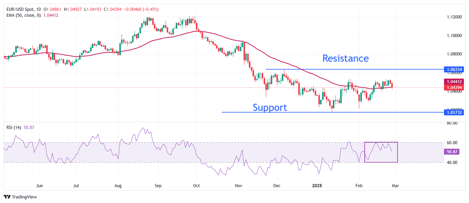 EUR/USD falls vertically to near 1.0420 after failing to hold above 1.0500 on Thursday. The major currency pair struggles to hold the 50-day Exponential Moving Average (EMA), which trades around 1.0440.