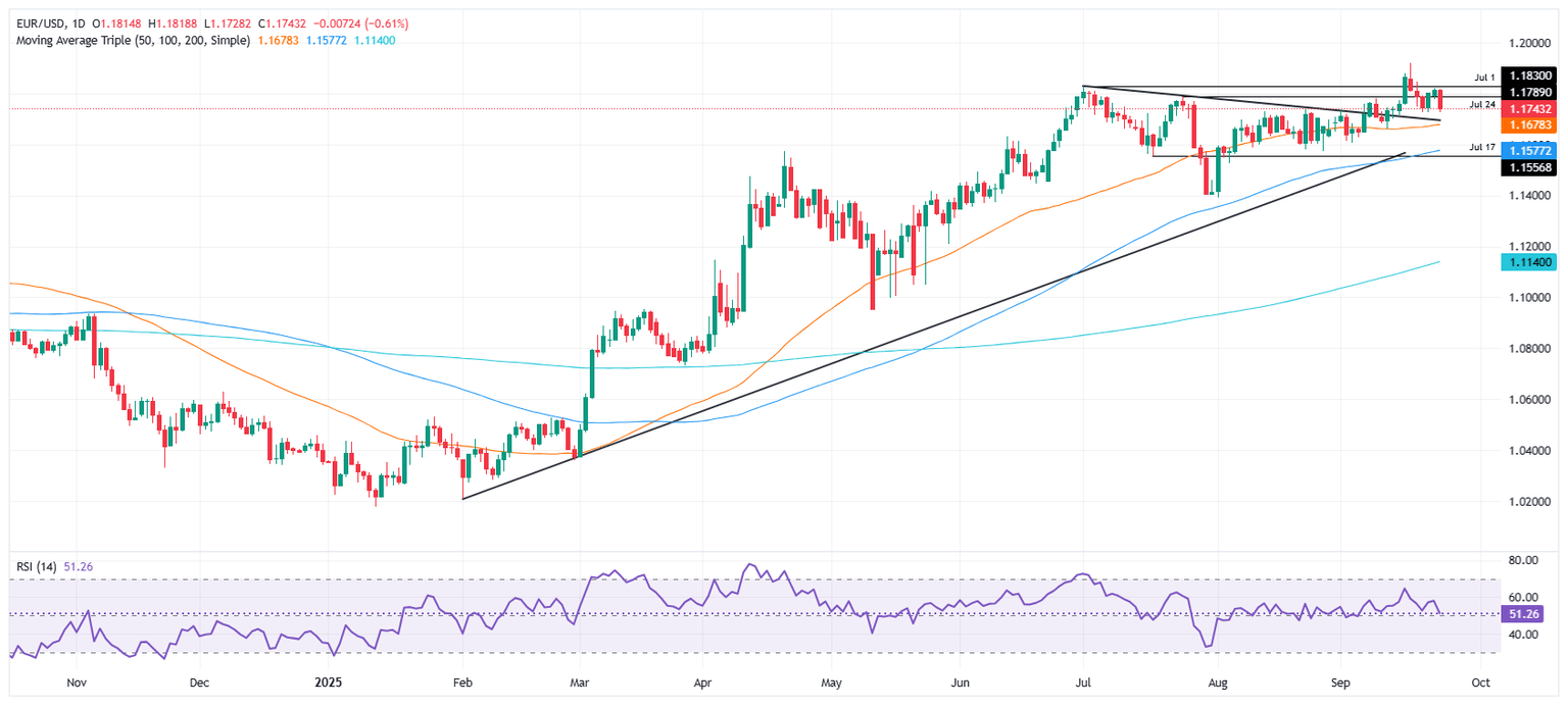 If EUR/USD clears 1.1700, the first support would be the 50-day Simple Moving Average (SMA) at 1.1678, followed by confluence of the 100-day SMA and the August 27 swing low near 1.1560–1.1584.