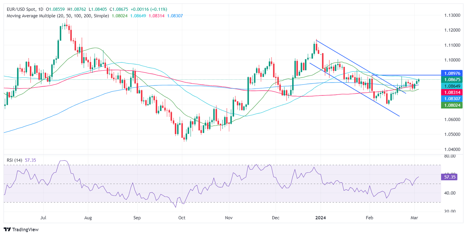 During the North American session, the Euro extended its gains of more than 0.10% as the Greenback weakness in early Tuesday trading. After meandering at around the day’s lows of 1.0840, weaker than expected US data, the EUR/USD trades at around 1.0870.