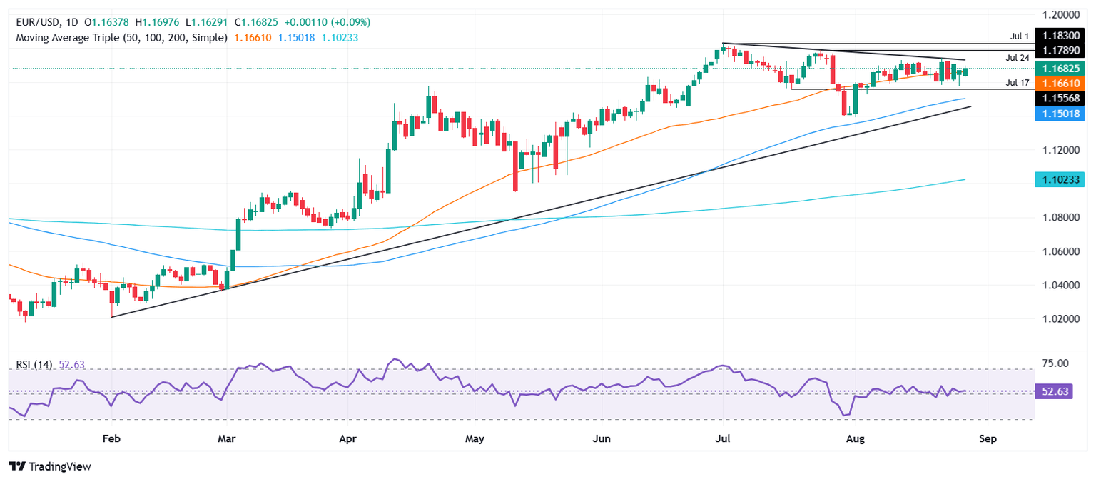 EUR/USD edges up late in the North American session on Thursday, as the US Dollar (USD) fails to gain traction on upbeat US data, amid the ongoing conflict between US President Donald Trump and Federal Reserve (Fed) Governor Lisa Cook. At the time of writing, the pair trades at 1.1688, up 0.43%.