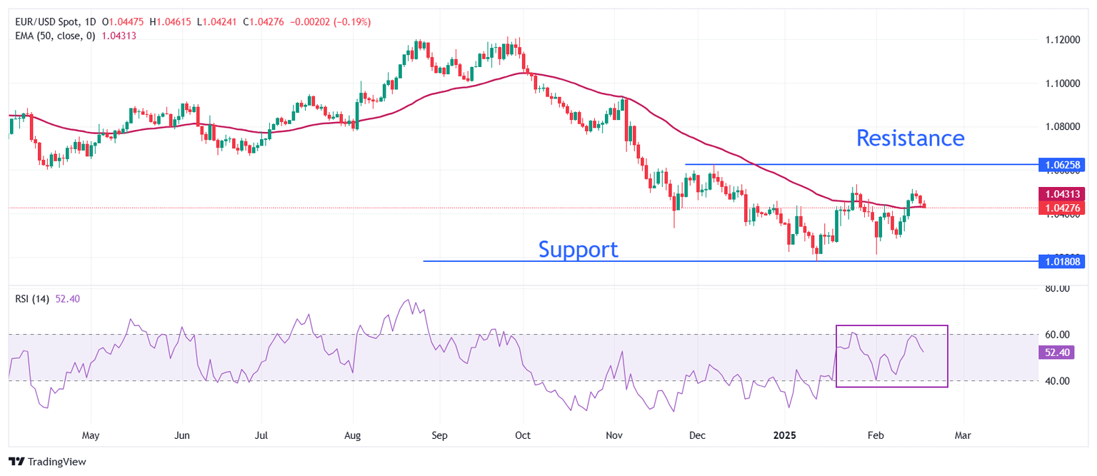 - EUR/USD is down as the US Dollar gains with investors becoming increasingly confident that the Federal Reserve (Fed) will keep interest rates in the current range of 4.25%-4.50% for longer. According to the CME FedWatch tool, the Fed is expected to keep interest rates steady in the March, May, and June policy meetings.