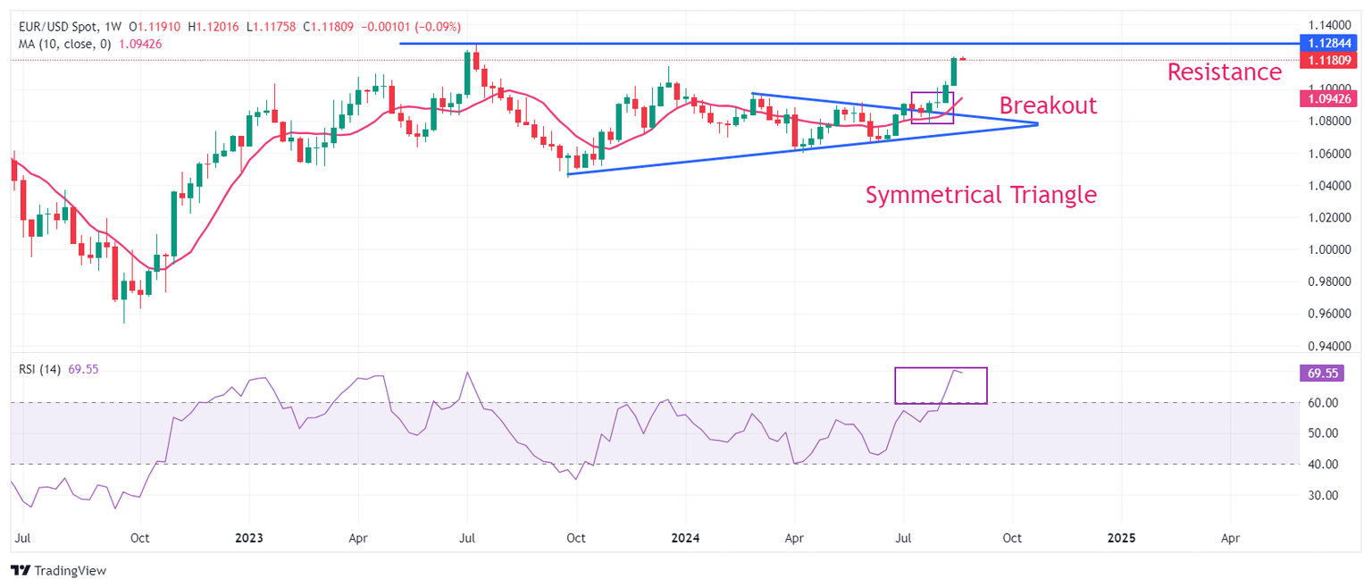 EUR/USD posted a fresh swing high at 1.1200 on the weekly timeframe, suggesting a bullish reversal. The major currency pair strengthened after a breakout of the Symmetrical Triangle chart pattern. The upward-sloping 10-week Exponential Moving Average (EMA) near 1.0940 warrants more upside ahead.