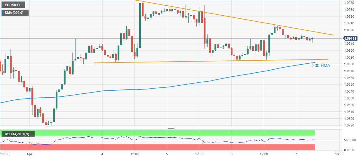 Meanwhile, a downside break of the 1.0885 level comprising the triangle’s lower line will defy the bullish chart pattern and can lure the EUR/USD bears. Even so, the 200-HMA level of 1.0880 can act as an extra filter towards the south before delivering the quote to the bear’s door.
