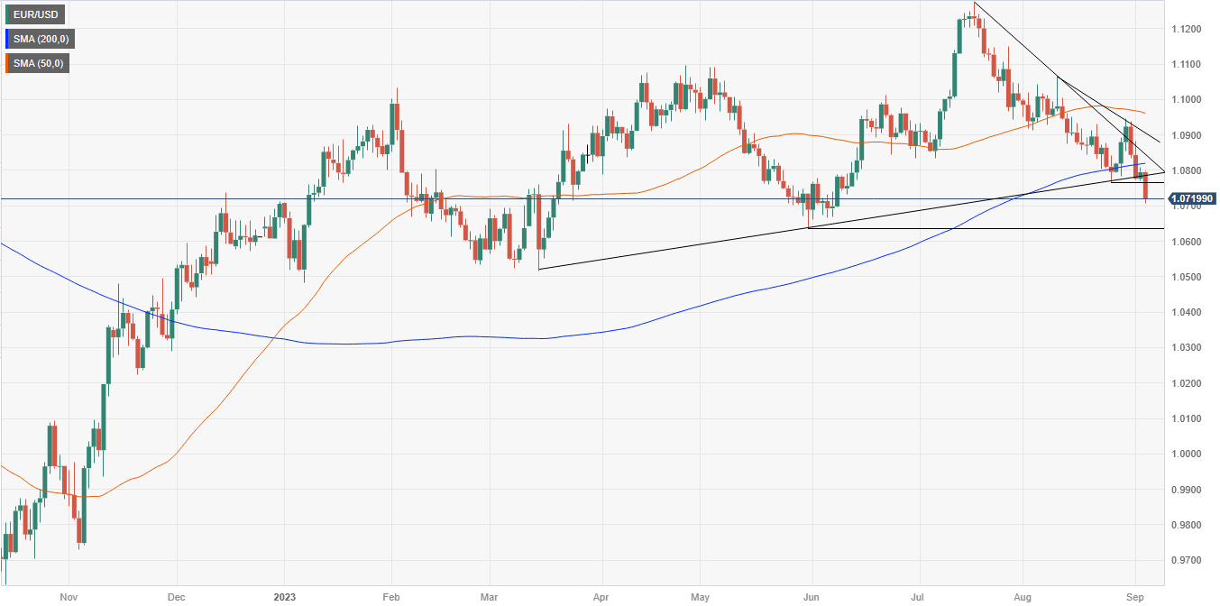 The Euro (EUR) extended its losses against the US Dollar in the mid-North American session on Tuesday after data revealed that business activity in the Eurozone (EU) is slowing down amid the most aggressive tightening cycle of the European Central Bank (ECB). This underpinned the Greenback, alongside Fed officials giving a green light for higher rates. The EUR/USD is trading at 1.0726, with losses of 0.63%.