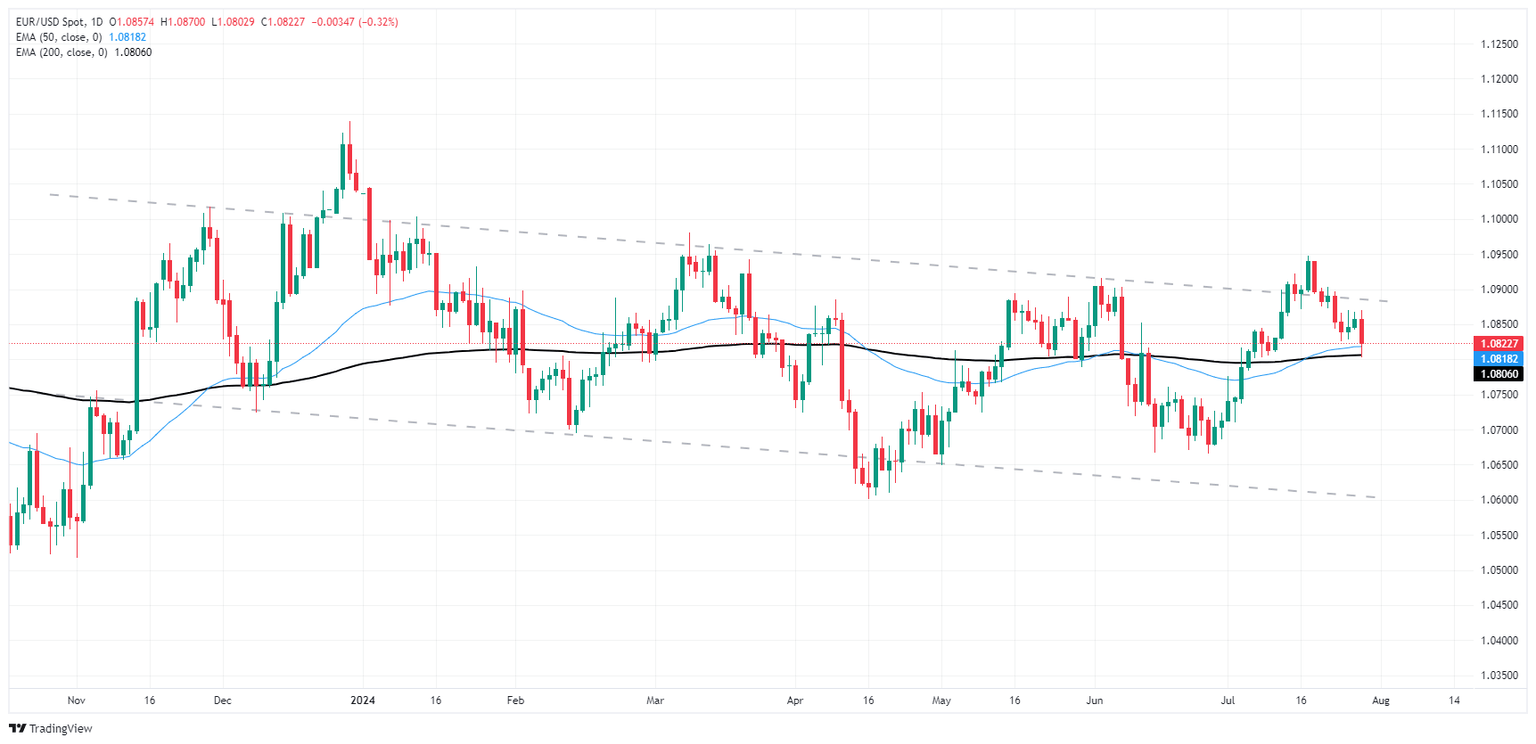 EUR/USD has fallen 1.3% top-to-bottom as bids backslide into long-term averages, and buyers are struggling to find a foothold as intraday price action battles with the 50-day EMA at 1.0818.