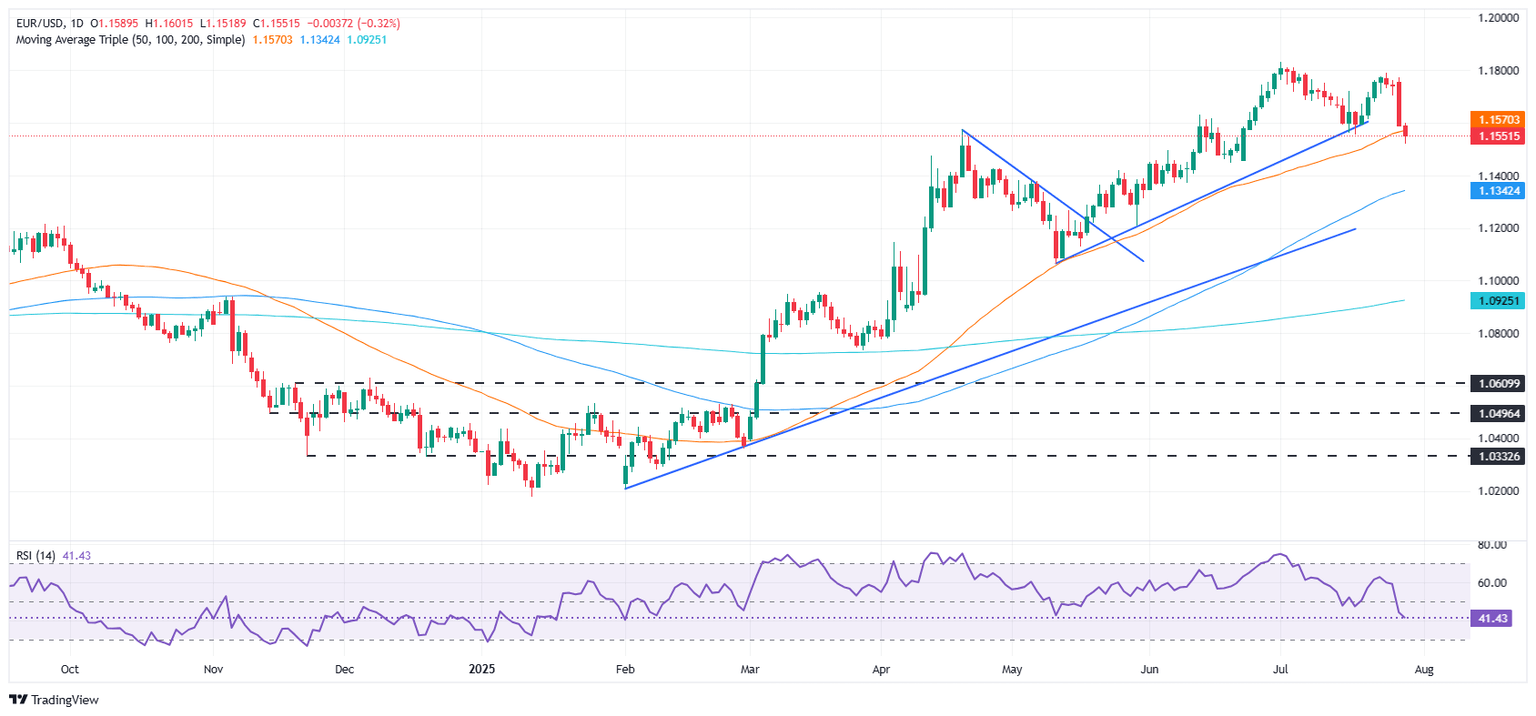 The EUR/USD resumed its downtrend for the second straight day as market participants digest softer-than-expected economic data from the United States (US). This and the trade agreement of the European Union (EU) and the US boosted the Dollar and weighed on the Euro, which posted a loss of more than 1.30% on Monday, the biggest since December 2024. The pair hovers around 1.1550, down 0.33% daily.