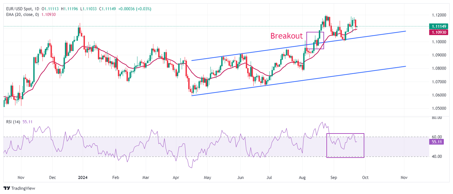 EUR/USD rebounds from 1.1100 in North American trading hours on Tuesday. The major currency pair finds support near the 20-day Exponential Moving Average (EMA) near 1.1090.