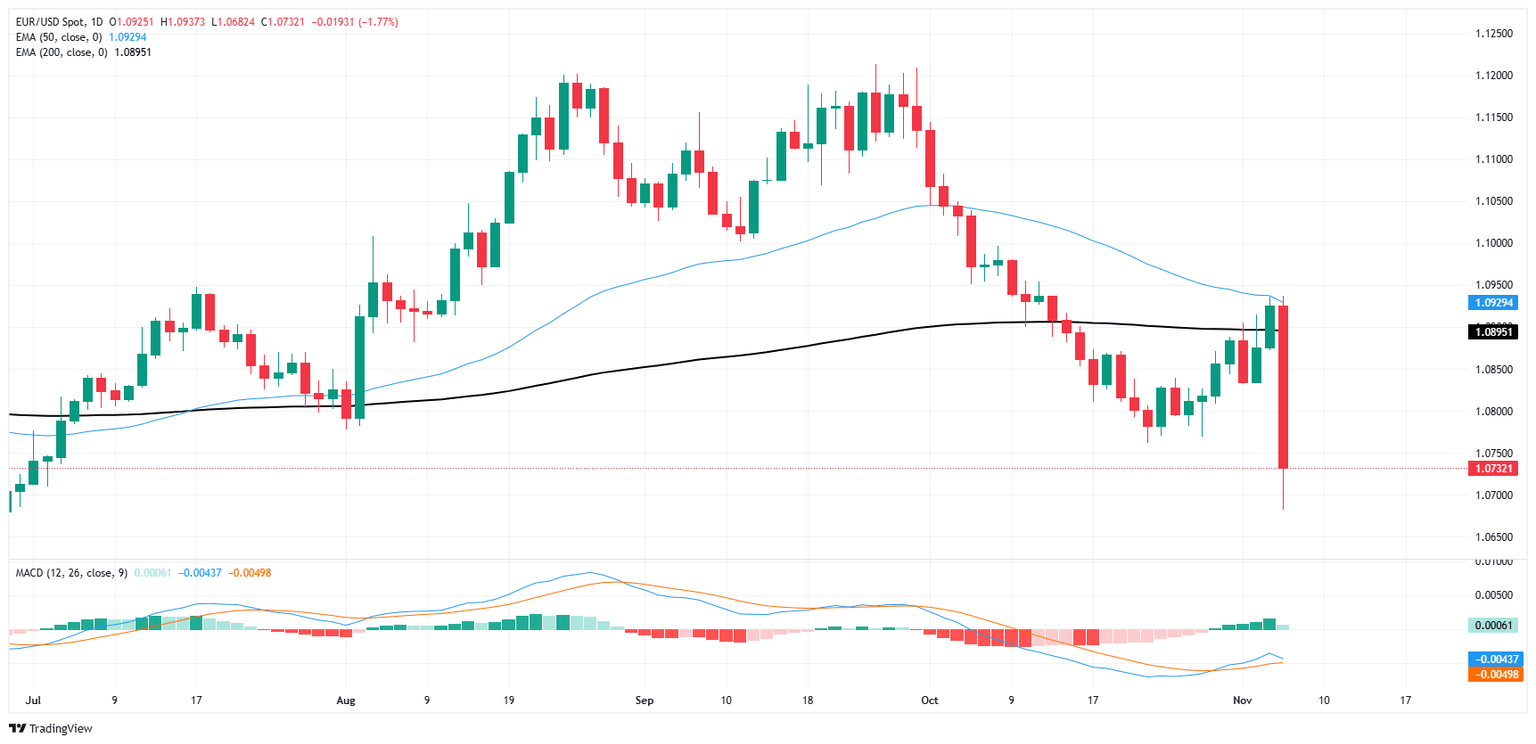 EUR/USD plummeted during the midweek market session, falling over 1.75% into the red and tumbling back below 1.0750 for the first time since July. Markets have broadly pivoted into the Greenback following clear results from this week’s US presidential election that sees former President Donald Trump as the frontrunner.
