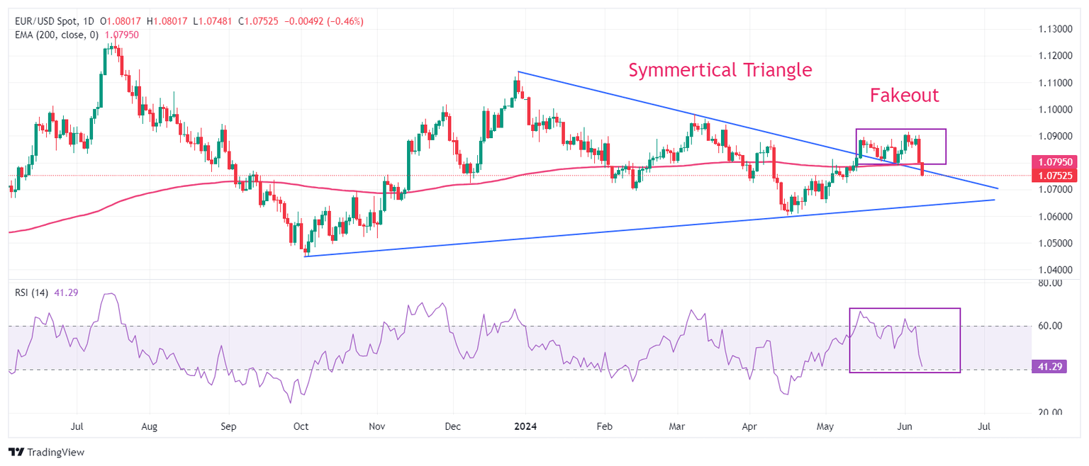EUR/USD extends its decline to 1.0730 in Monday's New York session. The major currency pair weakens as political uncertainty in the Eurozone after French President Emmanuel Macron calls for a snap election weighed heavily on the Euro. Macron’s unexpected move on Sunday evening came after exit polls indicated that Marine Le Pen’s far-right National Rally (RN) scored 32%-33% seats in European parliamentary elections under the leadership of the party’s president, Jordan Bardella, which was more than double from Macron’s centrist’s list.