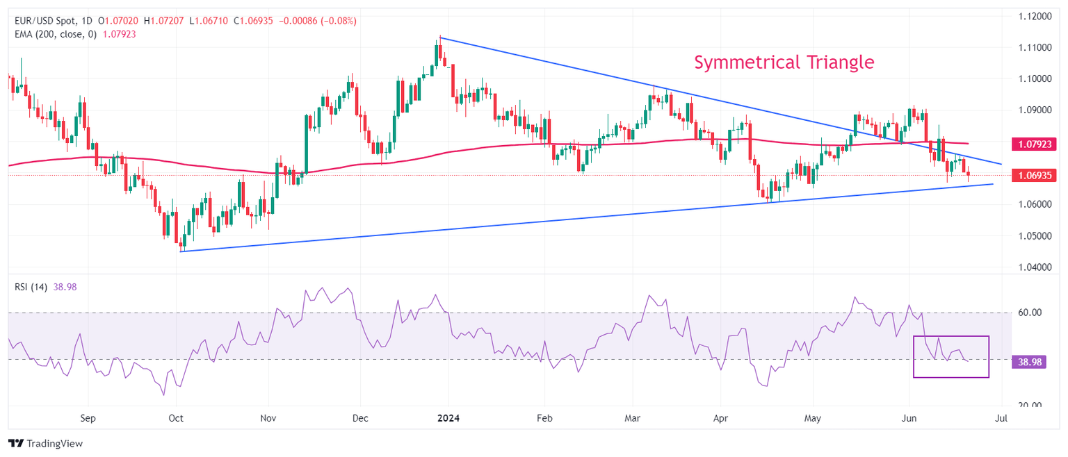 EUR/USD extends its correction below the crucial support of 1.0700. The major currency pair declines toward the upward-sloping border of the Symmetrical Triangle pattern formed on a daily time frame. The long-term outlook has become uncertain as the pair establishes below the 200-day Exponential Moving Average (EMA), which trades around 1.0800.