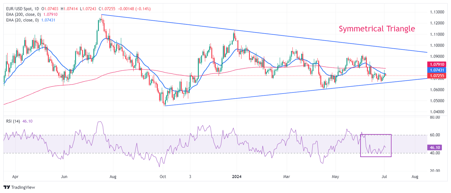 EUR/USD drops to near 1.0720 after failing to hold above the 20-day Exponential Moving Average (EMA), which trades around 1.0740. The major currency pair rebounded last week after discovering strong buying interest near the upward-sloping border of the Symmetrical Triangle formation on a daily timeframe near 1.0666, which is marked from 3 October 2023 low at 1.0448. The downward-sloping border of the above-mentioned chart pattern is plotted from 18 July 2023 high at 1.1276. The Symmetrical Triangle formation exhibits a sharp volatility contraction, which indicates low volume and narrow ticks.
