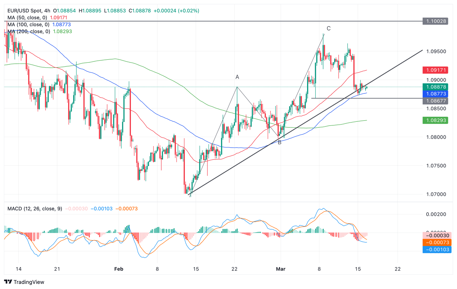 EUR/USD finds a temporary support as it extends its correction from the 1.0981 March 8 high.