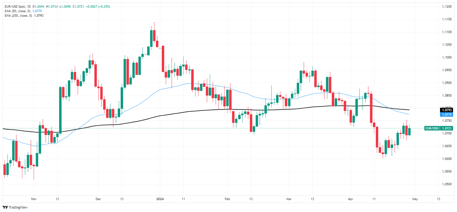 EUR/USD jostled on Monday, settling near 1.0720 after churning in a tight but lopsided range as markets settle in for the wait to Wednesday’s US Federal Reserve (Fed) outing. Investors broadly expect US rates to hold steady this week, but traders will be looking for an uptick in Fed guidance for when rate cuts could be coming. As of writing, the CME’s FedWatch Tool shows rate markets are pricing in 58% odds of a first rate cut in September.